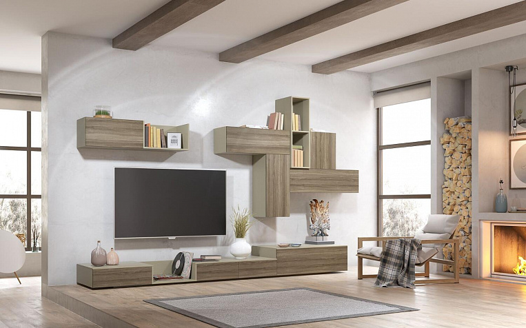 Композиция представляет собой напольную тумбу с выдвижными ящиками и несколько самостоятельных модулей, которые крепятся непосредственно к стене. Надежные механизмы выдерживают существенные нагрузки, однако и сама стена должна быть крепежной.