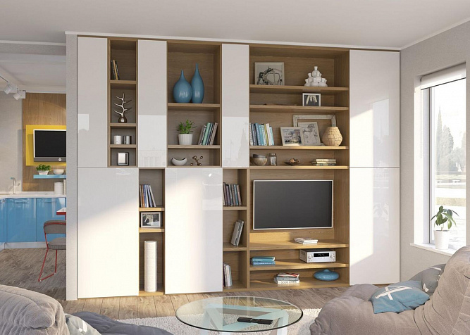 Для построения каркаса выбраны ламинированные панели ДСП в золотистом декоре «Орех опера» (толщина плиты 25 мм). Удачная имитация древесного рисунка безупречно сочетается с белым глянцем, которым отделаны фасады (листы МДФ, покрытые высокоглянцевой эмалью белого цвета).