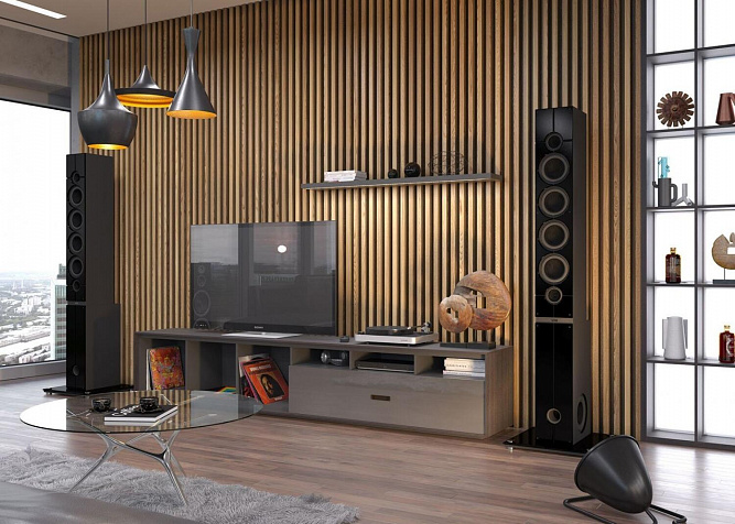 ТВ-зона представлена небольшим комодом, стоящим на подиуме, и консольной полкой. Каркас изготовлен из ламинированных панелей ДСП в декоре «Графит» и облицован панелями декора «Дуб Термо». Выдвижной ящик «Legrabox», лицевая панель представляет собой плиту МДФ в отделке высокоглянцевой эмалью (декор «Графит»), в которую врезана ручка «Break».
