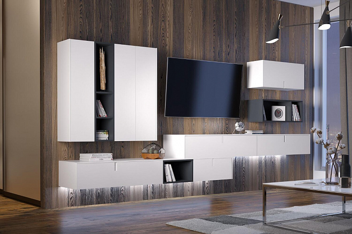 Для каркаса использованы ламинированные панели ДСП в декоре «Алебастр». Топы и сайды — тонкие панели МДФ — в отделке матовой белой эмалью. Откидной фасад (справа от телевизора) и передние стенки выдвижных ящиков представляют собой панели МДФ толщиной 19 мм в отделке матовой белоснежной эмалью, в которых предусмотрены врезные ручки «Spot 3/4». Открытые модули изготовлены из ДСП в декоре «Графит». Распашные фасады открываются с помощью инновационной системы «Р2О» (нажал-открыл). Вместительные выдвижные ящики оснащены механизмом полного открывания и плавной доводкой до крайнего положения.