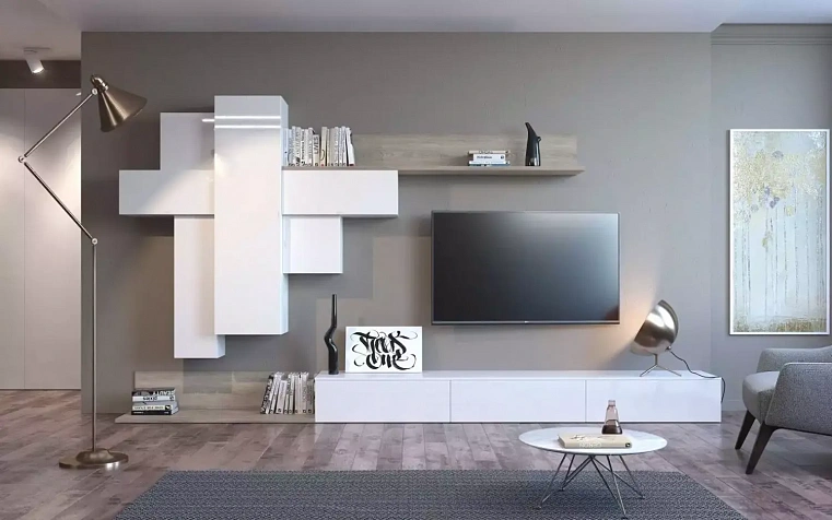 Корпус гостиной выполнен из ламинированной плиты в декоре «Белый Премиум».