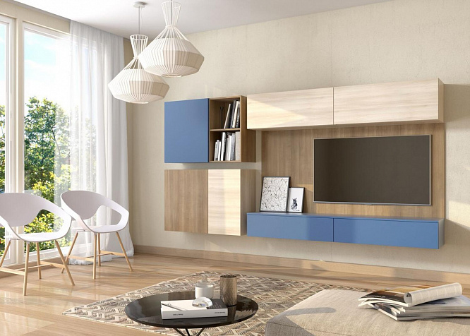 В гостиной применено «правило трех цветов»: декоры «Акация», «Орех Опера» и «Лазурит». Насыщенный голубой играет роль яркого акцента, в то время как древесные текстуры выступают мягким фоном и лаконично перекликаются с отделкой пола, стен и потолка комнаты. Материалом для каркаса служат ламинированные панели ДСП толщиной 16 мм. Задние стенки — панели ДСП толщиной 8 мм с резиновым уплотнителем по периметру.