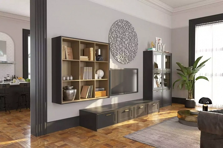 Корпус гостиной и подвесной открытый стеллаж выполнены из ламинированной плиты в декоре “Микролайн золото”. Фасады шкафа, тумбы и стеллажа “Shaker”, сайды и топ из МДФ декорированы матовой эмалью “Графит”. В дверцах шкафа (верхние фасады) вставки из прозрачного стекла. Фурнитура - ручки серии PULL.