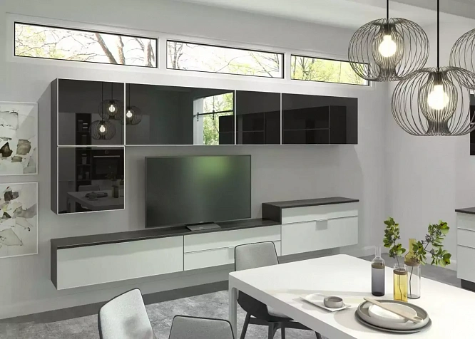 Этот проект определенно заслуживает внимание тех, кто любит стильную современную мебель. Интересное оформление фасадов, рациональное расположение элементов делают этот ТВ-юнит необычным и запоминающимся. Вместе с тем шкафы композиции вместят достаточное количество полезных вещей. Мы ждем вас в Ателье мебели Mr.Doors!