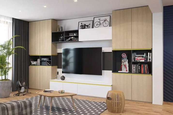 Для открытых элементов и ТВ-юнита используется тёплая светодиодная LED-подсветка. Мебель изготавливается на заказ по индивидуальным размерам, сборка осуществляется специалистами Mr.Doors: комплект подойдёт для вашей гостиной идеально.