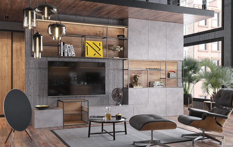 Корпусные и фасадные элементы выполнены из ламинированной плиты в декорах «Дуб Галифакс» из программы FEELWOOD (структура идеально имитирует поверхность натурального дерева) и «Бетон Чикаго светлый».