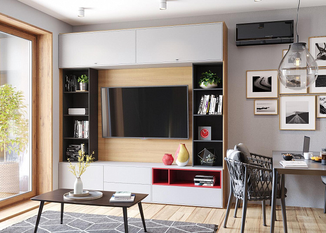 Корпусные элементы и фасады изготовлены из ламинированной плиты в декоре «Гейнсборо». Стеллажи по бокам от ТВ — в декоре «Графит», а яркие красные полки — в декоре «Маки».