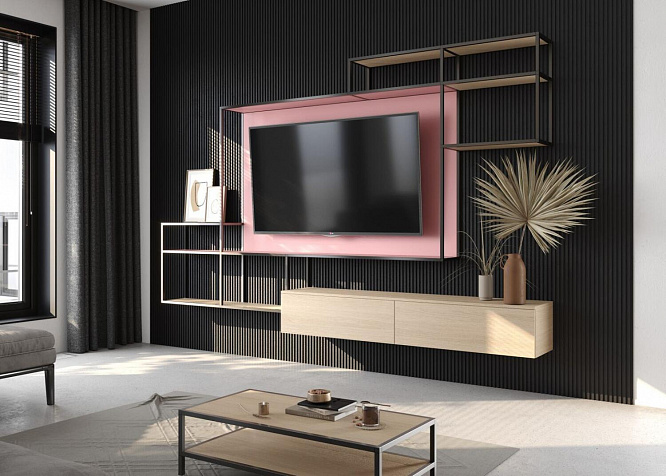 Вся система вокруг ТВ и журнальный столик спроектированы с помощью металлических стоек «Кадро».