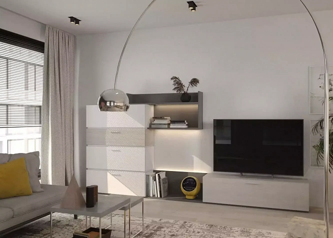 Удачное решение — чередование открытых полок и закрытых ящиков. При этом мебель вместительная: места достаточно, чтобы распределить по полкам и ящикам книги, сувениры, документы, технику и многое другое. Комплект изготавливается на заказ по индивидуальным размерам и подойдёт как для отдельной гостиной, так и для зоны отдыха в квартире-студии. Цветовое решение универсально: гостиная группа будет уместно выглядеть в интерьере, оформленном в любых тонах.