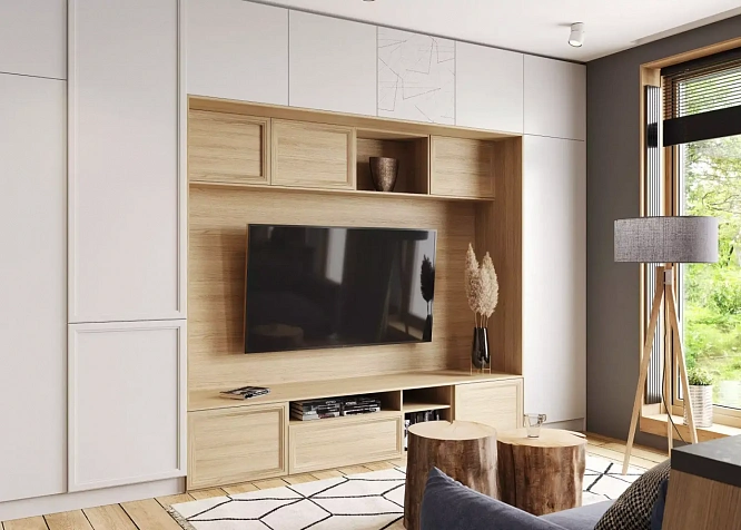 Если вам нравится отделка под натуральное дерево и светлые цвета оформления стоит присмотреться к этому проекту. Гостиная отлично будет смотреться в светлой комнате с окнами во всю стену. ;