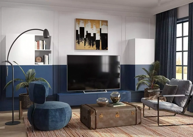 Комплект мебели представлен закрытыми боксами для хранения, открытыми полками и ТВ-юнитом, оснащённым объёмными выдвижными ящиками. Механизм полного выдвижения и наличие доводчиков обеспечивает максимальное удобство использования;