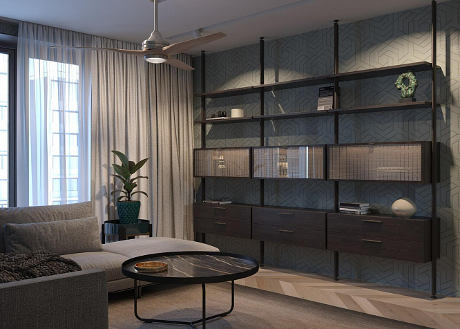 Стеллажная система может быть абсолютно любой, подстраиваясь по ваши вкусы и предпочтения. Вы можете заказать готовый проект, а можете дополнить его своими идеями, увеличив или уменьшив в зависимости от размеров гостиной. Ждем вас в Mr.Doors!