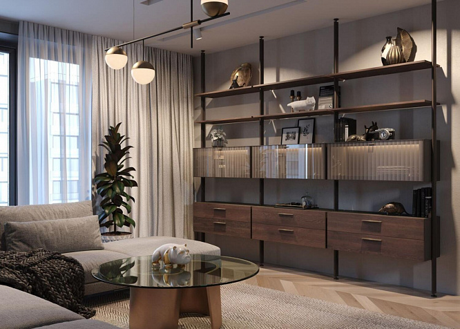 Стеллажная система это новый взгляд на организацию интерьера гостиной. Это не привычная всем стенка, а функциональное решение, позволяющее разместить книги, фоторамки, сувениры. При этом она просто стильно выглядит.