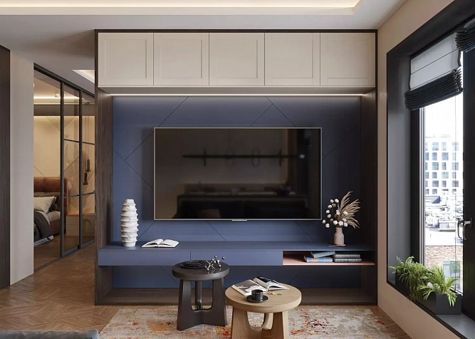 фасады – серия “Campo” (МДФ в матовой эмали) в декорах “Гейнсборо” и “Орион” (синий);