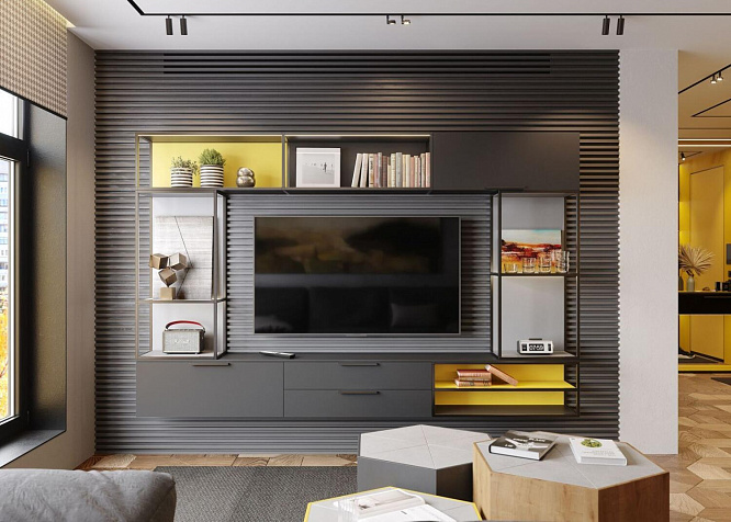 Вся мебель достаточно узкая и компактная. Это позволяет с максимальной пользой использовать каждый сантиметр. Подключение проводов и коммуникации можно удобно спрятать в корпус ТВ-юнита. Так они не будут мешать картине интерьера. На открытых полочках достаточно места, чтобы разместить декоративные элементы: фотографии, вазы или сувениры. Открытые секции имеют встроенную подсветку, которая создает определенную атмосферу и подчеркивает уникальный дизайн.