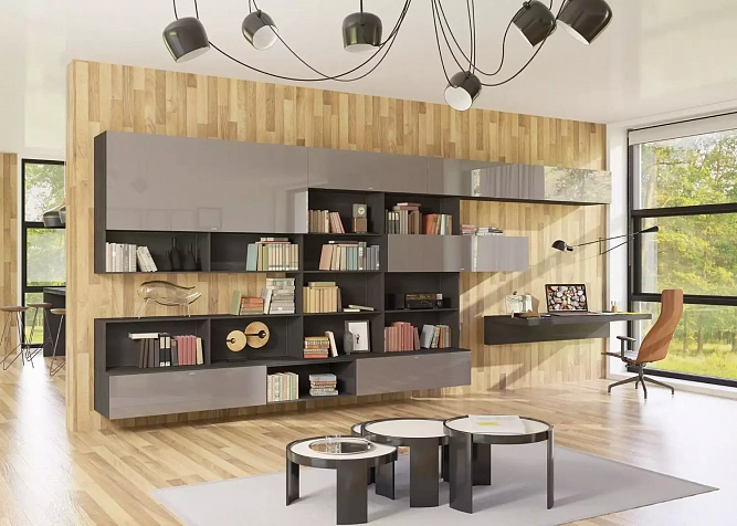 Дизайн гостиной-кабинета (на фото) – яркий пример динамичной и инновационной коллекции «DaySystem», которая разработана именитым архитектурным бюро (Италия) эксклюзивно для тех, кто выбирает для себя качественную мебель Mr.Doors
