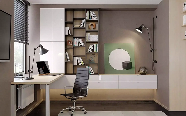 Основные декоры каркаса — «Акация» (в текстуре дерева) и «Черный». Распашные и откидной фасады и передние стенки выдвижных ящиков изготовлены из МДФ с покрытием из контрастной высокоглянцевой эмали (декор «Белый»). Столешница из ЛДСП толщиной 38 мм крепится к фасаду кабинета с одной стороны и поддерживается эффектными декоративными опорами с другой. ;