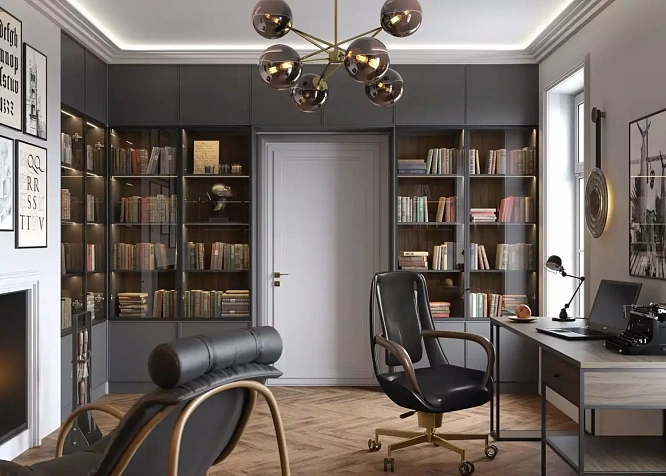 Кабинет-библиотека выполнен в современном стиле. Мебель одновременно красива и практична, встроенный шкаф идеально подходит для книг и документов. Витринные фасады «Джамп 20» остеклены декоративным стеклом «Гавана». Затемнённое, оно защищает бумагу от действия прямых солнечных лучей, а значит, продлевает жизнь собраниям сочинений любимых писателей. Часть фасадов не стеклянные, а глухие, из МДФ в плёнке «Урбан Графит». Асфальтовый оттенок смотрится стильно, вместе с тем, он универсален: подойдёт для помещения, оформленного в любой цветовой гамме. Корпус выполнен из ламинированной плиты в декоре «Ситивуд Чёрный», задние стенки и столешница рабочего стола декорированы в варианте «Орех Карини». Материал достойно имитирует натуральное дерево.