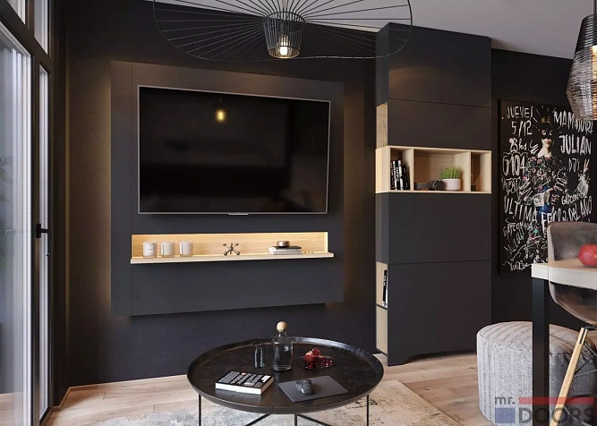 Корпусные и фасадные элементы выполнены из ламинированной плиты в декорах “Графит” и “Дуб Винченца”.