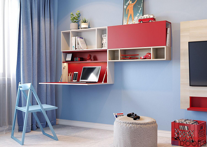 Подвесную систему хранения с откидным столиком можно заказать в Ателье мебели Mr.Doors вашего города. Расположение ящиков, их цвет и размер можно изменить совместно с дизайнером с учетом ваших пожеланий. Ждем вас!