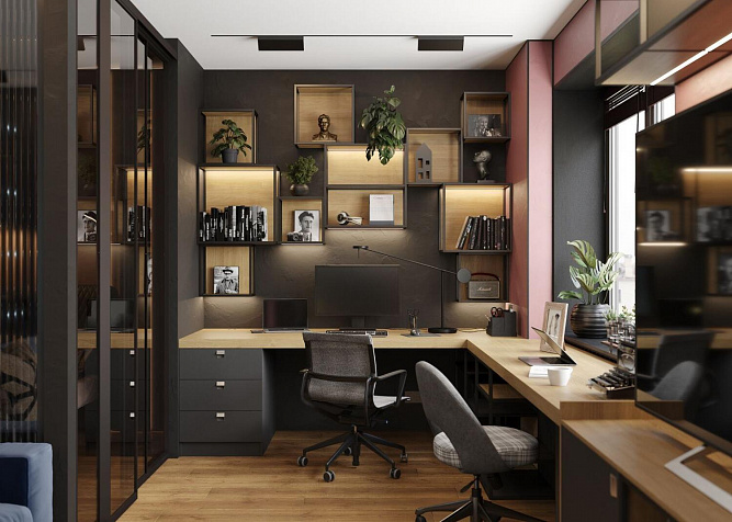 Если в вашей семье есть необходимость в двух рабочих местах, вы можете реализовать этот проект у себя дома. Он предусматривает все необходимое не только для полноценной работы или творчества, но и для отдыха.