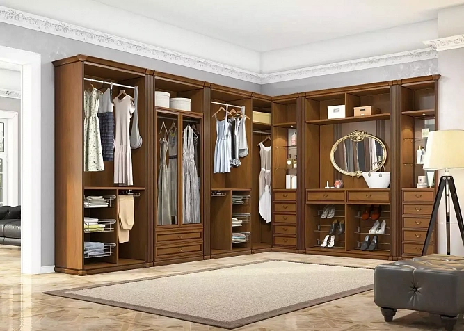 Эта угловая система включает всё необходимое для современного человека: удобные вешала, ящики и корзины для белья, выкатные кронштейны для брюк и держатели, на которых можно разместить как спортивную обувь, так и на высоком каблуке.