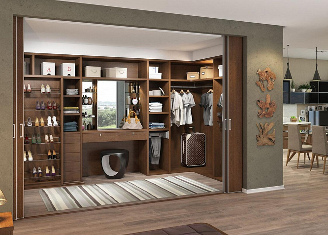 Что касается дверей гардеробной, то они двухсторонние. Лицевой фасад изготовлен полностью из МДФ с декором «Орех Американский», внутренняя часть — из серебряной зеркальной поверхности. Этим достигается двойной эффект: вы видите себя во всех ракурсах, а сама ниша кажется больше.