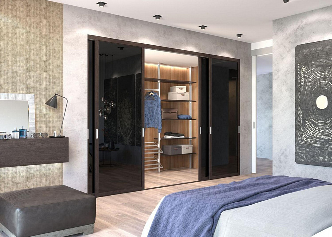Гардеробная (арт. 047) — стильная встроенная композиция с дверьми-купе из декоративного стекла «Нуар».