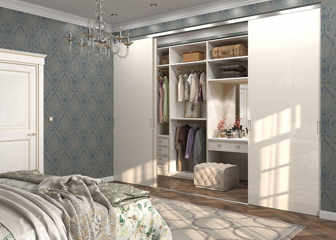 Гардеробная (арт. 050) — это классика, удачно скрещённая с современными веяниями моды. От посторонних глаз её скрывают двери-купе «Шифт» со стеклянным покрытием «Жемчуг». Отсутствие рам позволяет органично встроить их в интерьер, конструкция словно парит над полом.