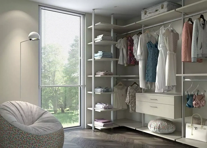 Основа этой мебельной композиции — алюминиевые стойки «Лофт» серебристого цвета, они лёгкие и надёжные, а за безопасность всей конструкции отвечает крепление как к полу, так и к потолку.