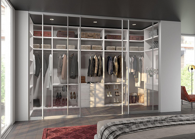 Двери-купе «Лайт-А» выполнены из анодированного алюминия и имеют вставки из прозрачного стекла. Все вещи на виду, но при этом создается ощущение интимной обстановки, когда гардеробная кажется отдельным царством.