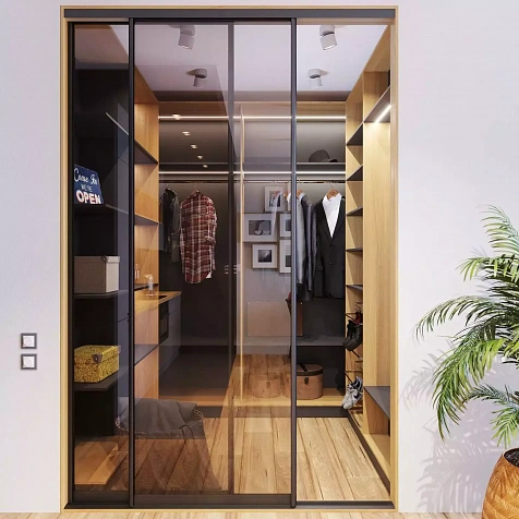 Раздвижные перегородки серии «Лайт-А» в декоре «Чёрный шёлк» декорированы вставками из стекла «Гавана».