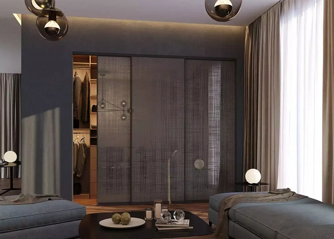 Гардеробная (арт. 078) за раздвижными дверями системы Visio-T имеет стильные декоративные вставки и удобную систему вешал с полками. Для тех, кто не любит прозрачные створки, это идеальный вариант.