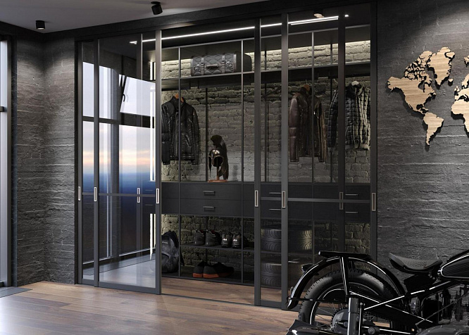 Корпусные элементы гардеробной выполнены из ламинированной плиты в декоре «Ситивуд чёрный», наполнение сформировано на основе ; системы «Кадро» и включает полки, вешалы и ящики. Стиль мебели подчеркнут LED-подсветкой. Двери заключены в алюминиевую двухфрагментную раму в плёнке «Графит» со вставками из стекла «Прозрачное».