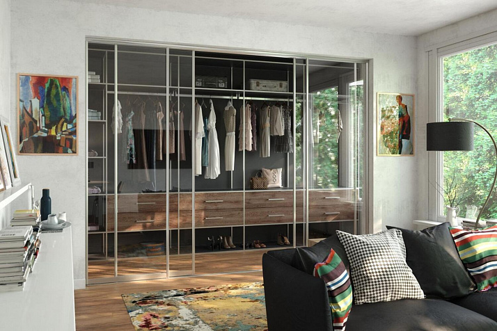 Гардеробная сконструирована из корпусных элементов, выполненных из ; ламинированных плит в декоре «Муссон» и алюминиевых стоек «Кадро». Лицевые панели выдвижных ящиков – плита TSS в декоре «Династия коньяк». Материал с высокой достоверностью имитирует поверхность древесины, это обеспечивается наличием глубоких пор, естественного спила и ручной обработки материала. Рамы раздвижных дверей системы Visio-V выполнены в декоре «Матовое серебро», вставки – стекло «Прозрачное».
