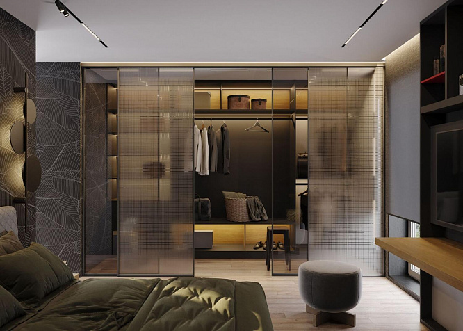 Двери-купе из стекла Мегаполис, установленного на профиль из алюминиевых рам. Треки также выполнены в тон алюминиевому профилю в черном декоре