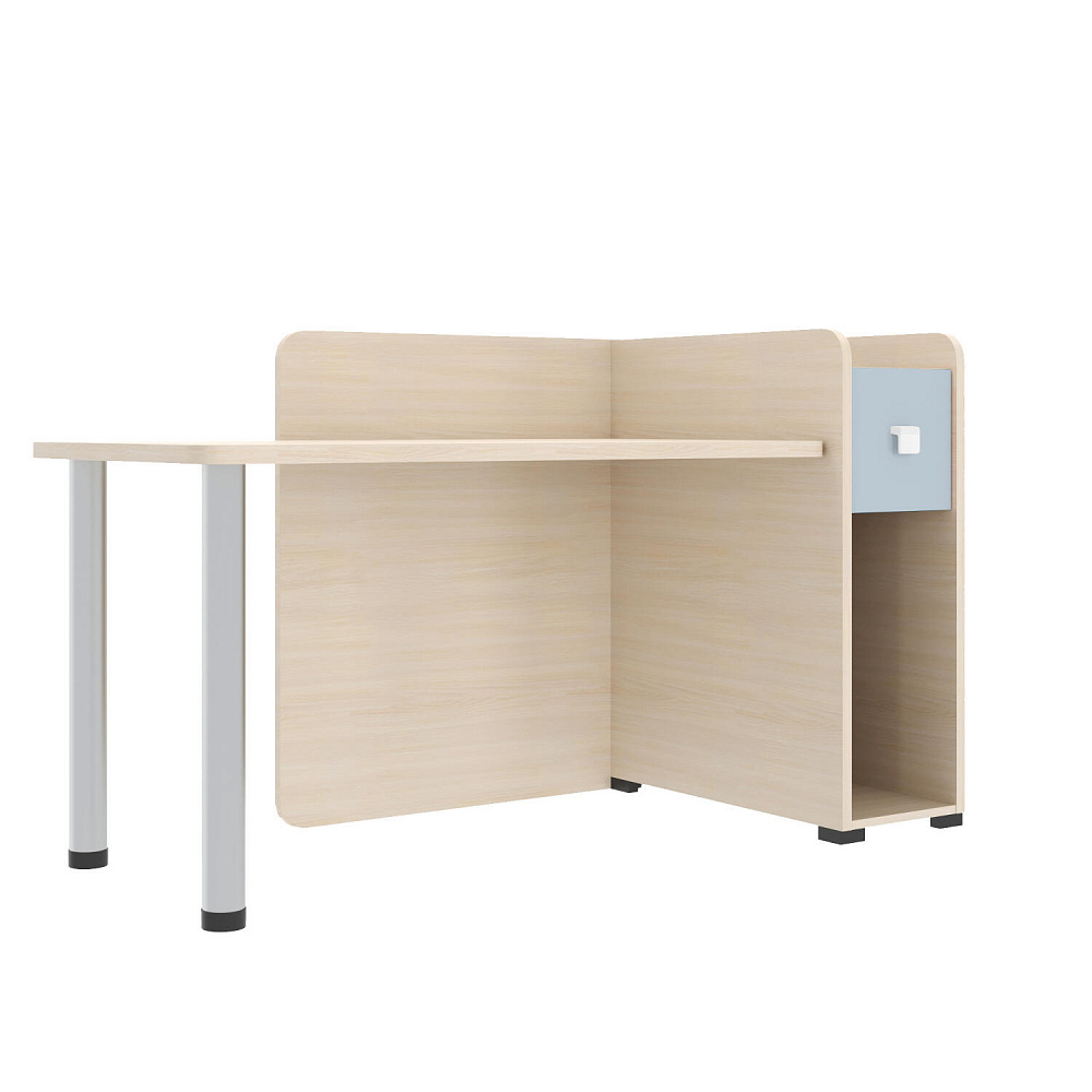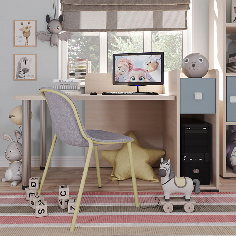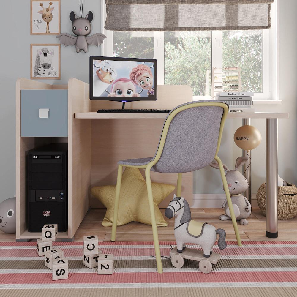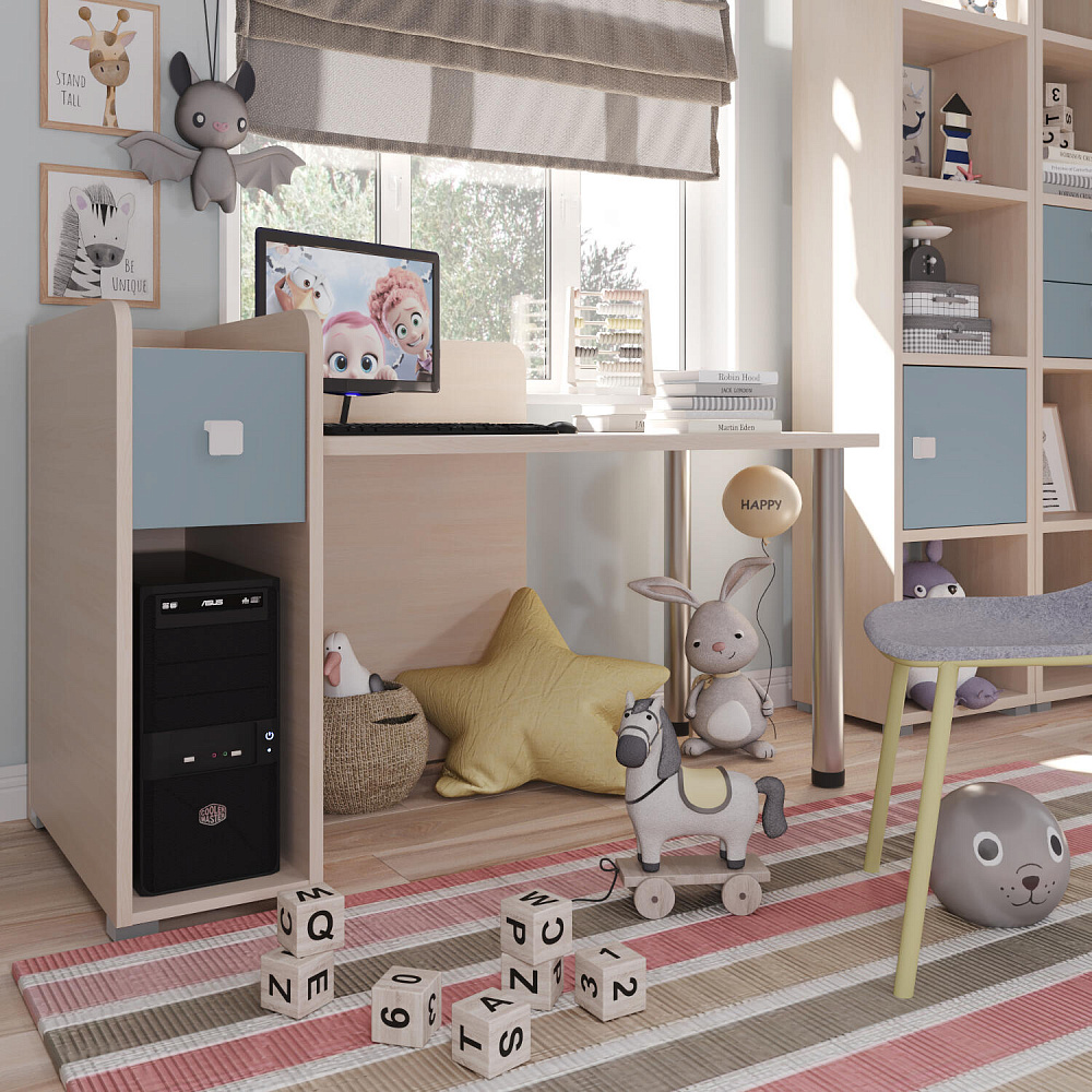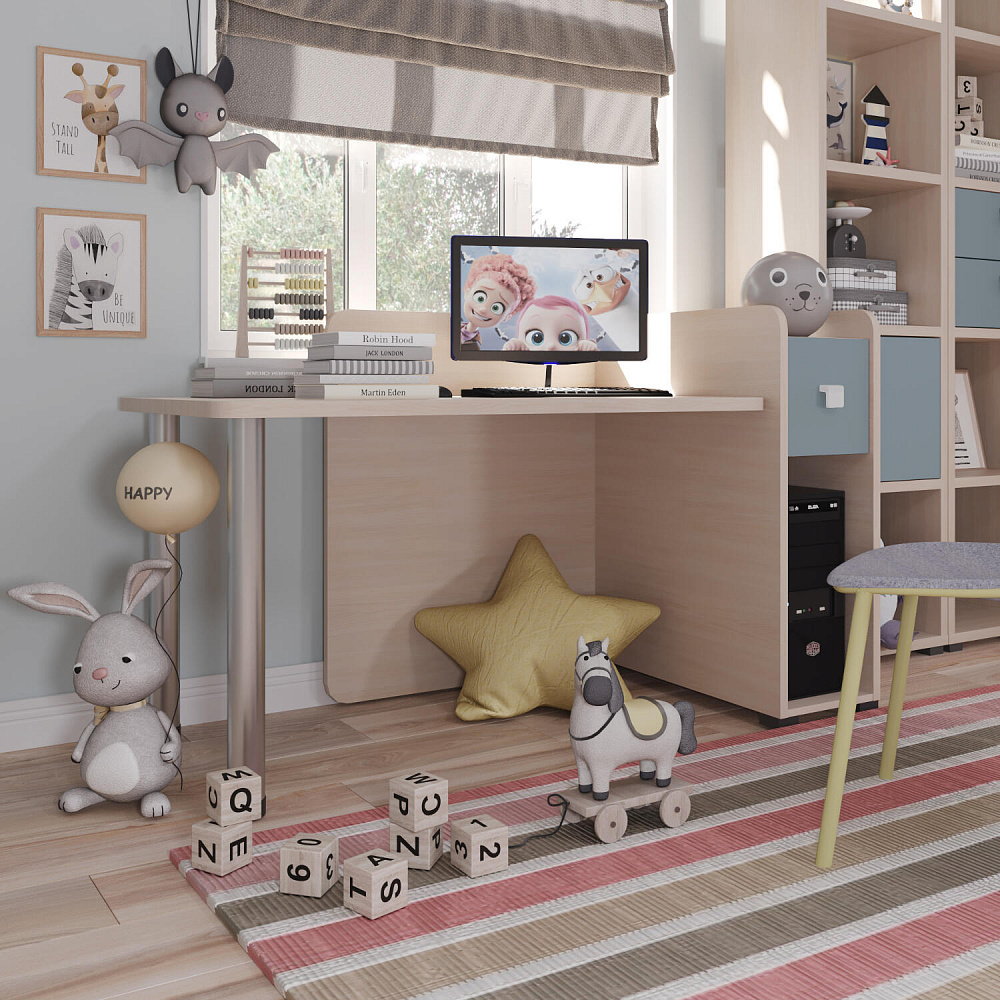Просторная столешница с отверстием для проводов. Широкая столешница позволяет установить компьютер и разложить необходимые для учёбы и творчества материалы. В крышке стола предусмотрено отверстие для удобного вывода проводов.