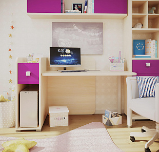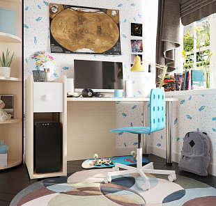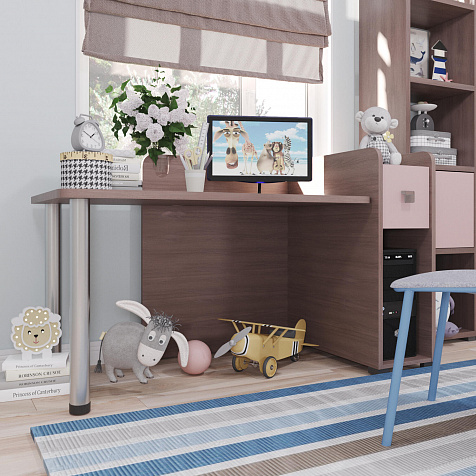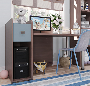 Просторная столешница с отверстием для проводов. Широкая столешница позволяет установить компьютер и разложить необходимые для учёбы и творчества материалы. В крышке стола предусмотрено отверстие для удобного вывода проводов.