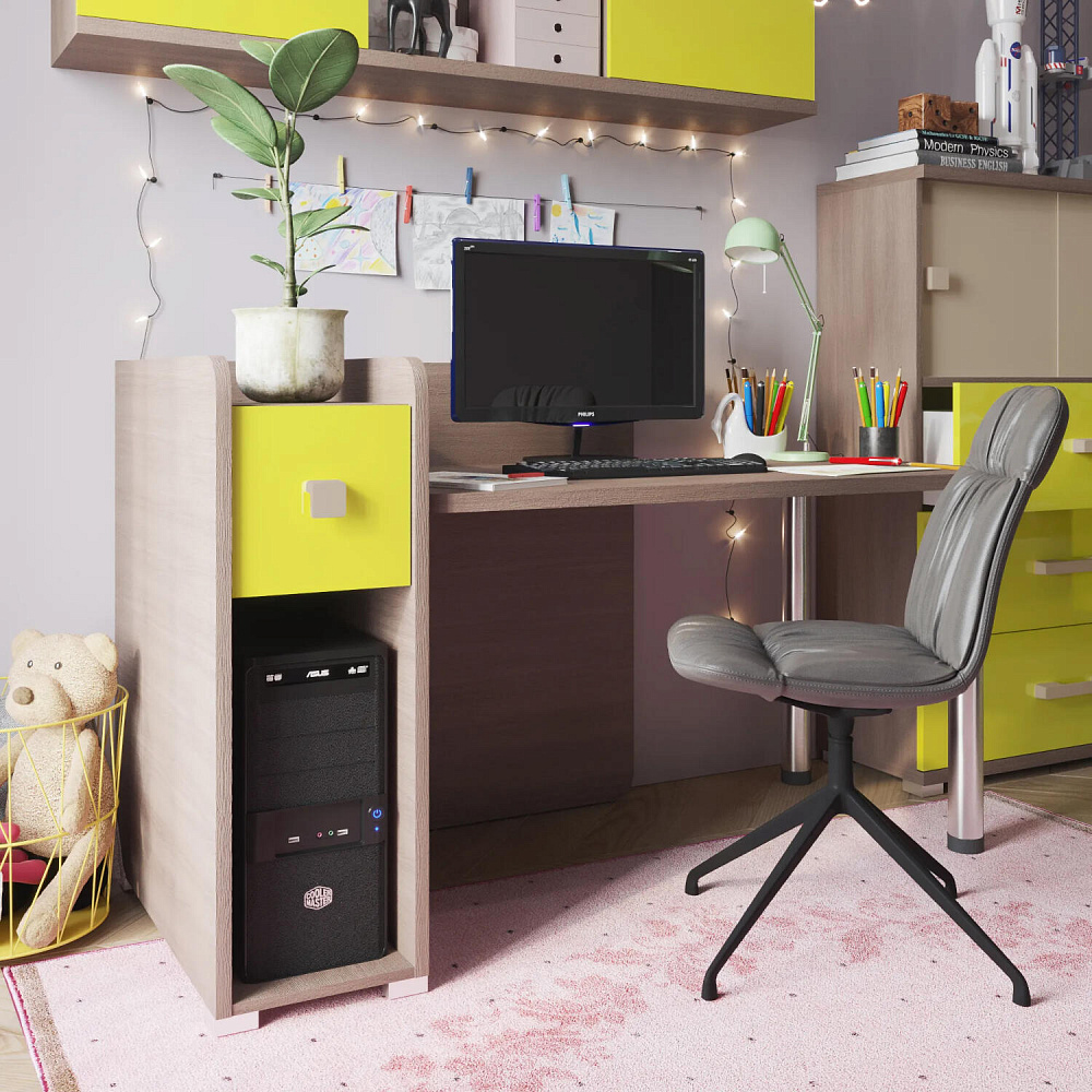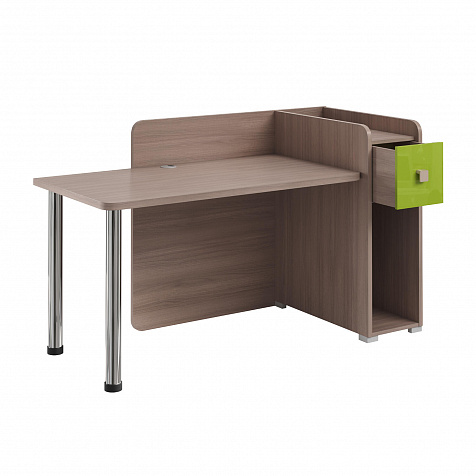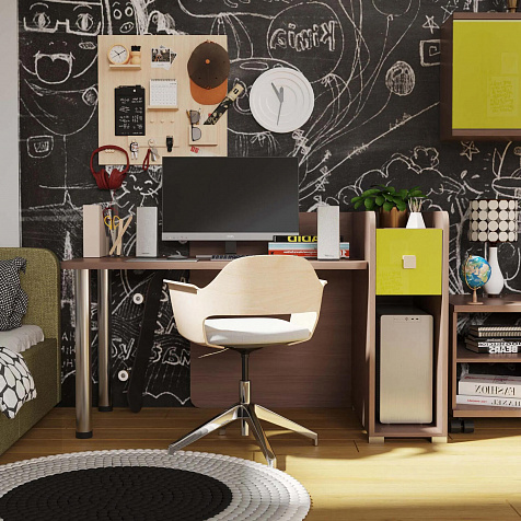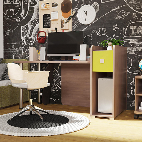 Просторная столешница с отверстием для проводов. Широкая столешница позволяет установить компьютер и разложить необходимые для учёбы и творчества материалы. В крышке стола предусмотрено отверстие для удобного вывода проводов.