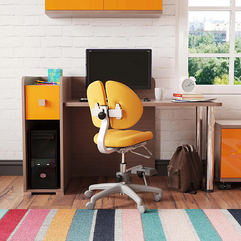 Просторная столешница с отверстием для проводов. Широкая столешница позволяет установить компьютер и разложить необходимые для учёбы и творчества материалы. В крышке стола предусмотрено отверстие для удобного вывода проводов.