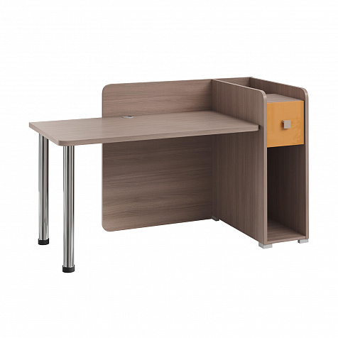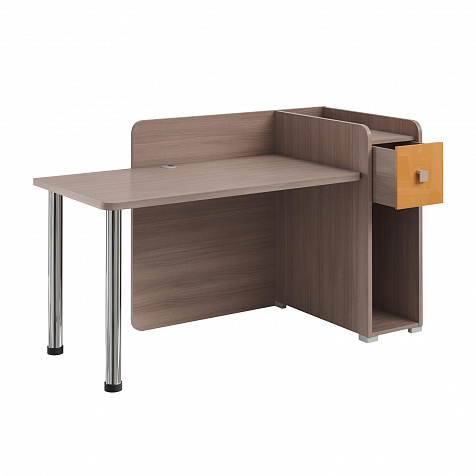 Тумба с нишей, ящиком и органайзером. Функциональная тумба имеет пространство для установки системного блока, над ней предусмотрен ящик, а за ящиком есть органайзер с двумя отделениями для канцелярских мелочей.