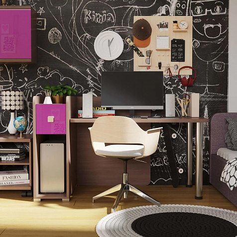 Просторная столешница с отверстием для проводов. Широкая столешница позволяет установить компьютер и разложить необходимые для учёбы и творчества материалы. В крышке стола предусмотрено отверстие для удобного вывода проводов.