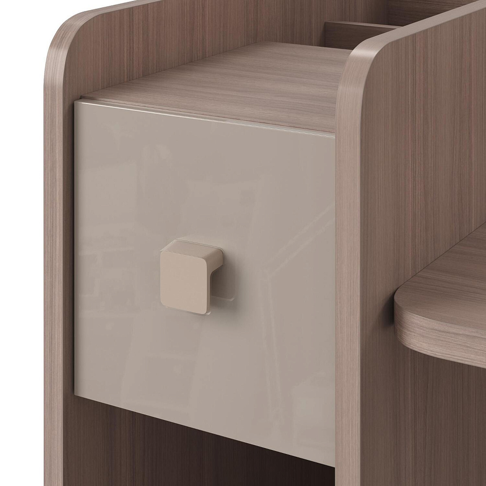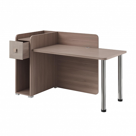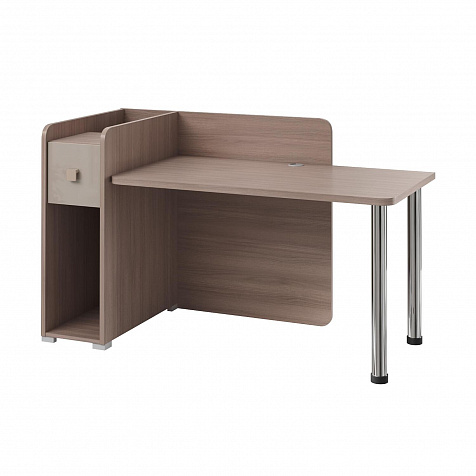 Тумба с нишей, ящиком и органайзером. Функциональная тумба имеет пространство для установки системного блока, над ней предусмотрен ящик, а за ящиком есть органайзер с двумя отделениями для канцелярских мелочей.
