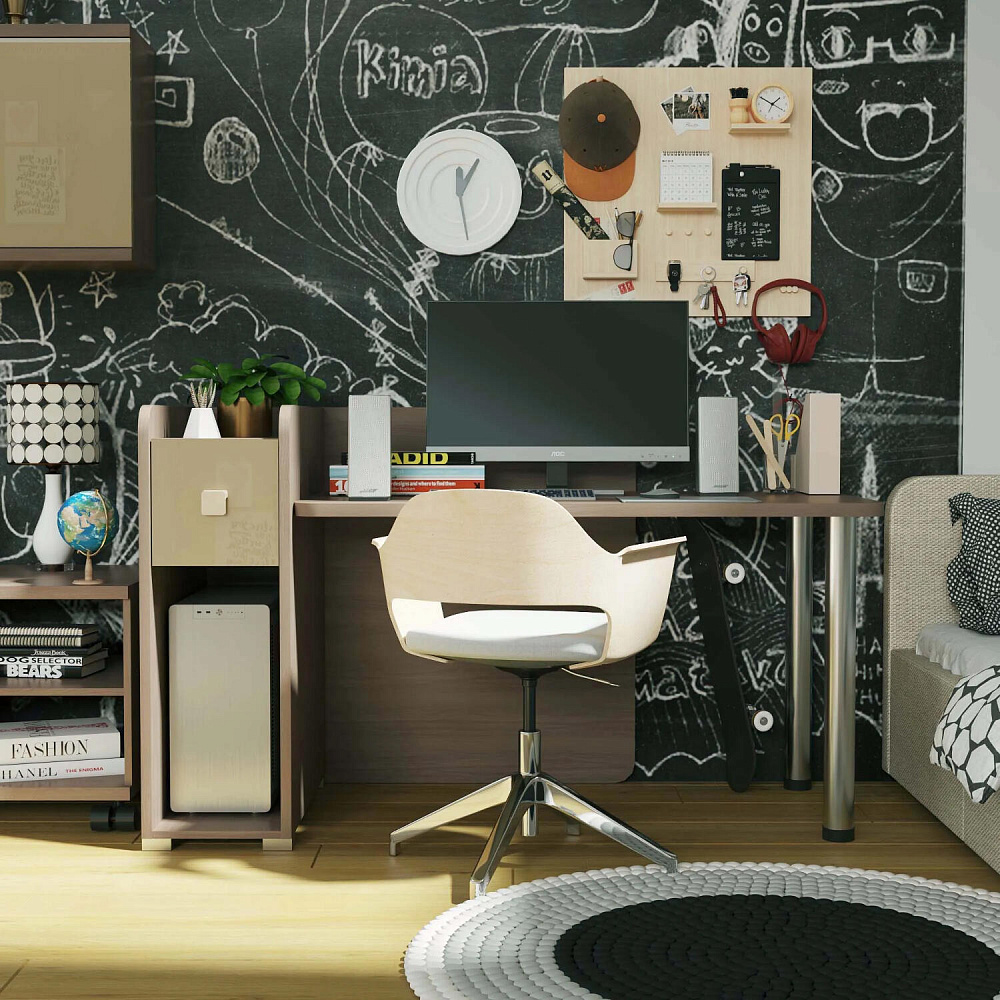Просторная столешница с отверстием для проводов. Широкая столешница позволяет установить компьютер и разложить необходимые для учёбы и творчества материалы. В крышке стола предусмотрено отверстие для удобного вывода проводов.