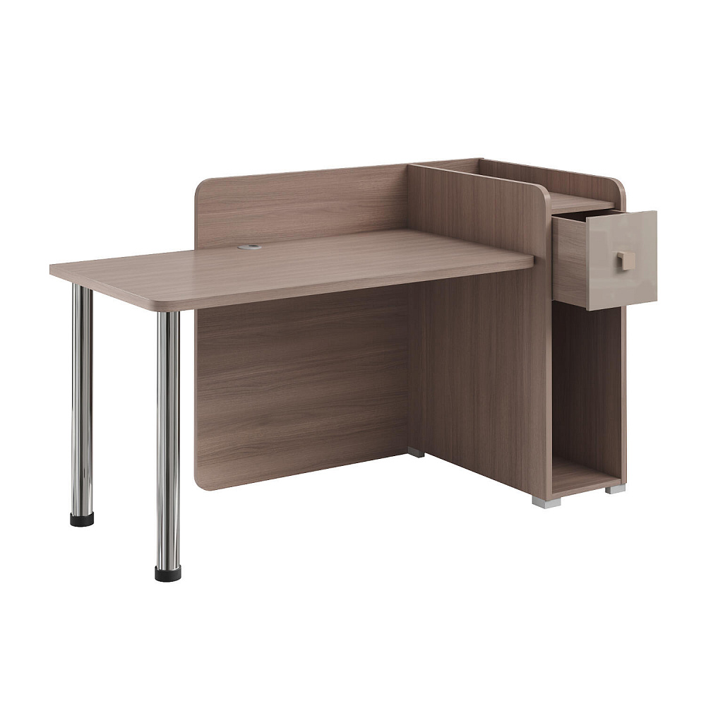 Тумба с нишей, ящиком и органайзером. Функциональная тумба имеет пространство для установки системного блока, над ней предусмотрен ящик, а за ящиком есть органайзер с двумя отделениями для канцелярских мелочей.
