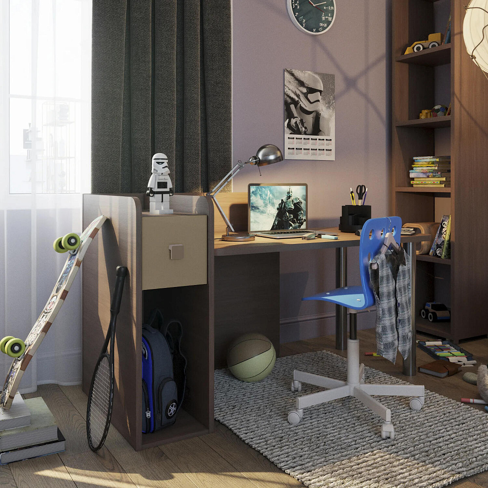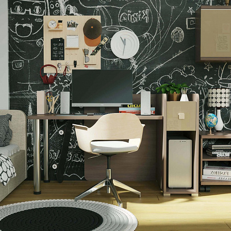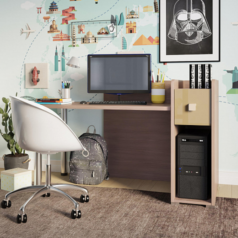 Просторная столешница с отверстием для проводов. Широкая столешница позволяет установить компьютер и разложить необходимые для учёбы и творчества материалы. В крышке стола предусмотрено отверстие для удобного вывода проводов.