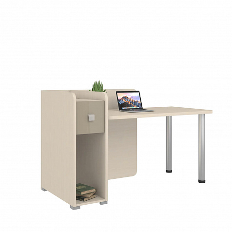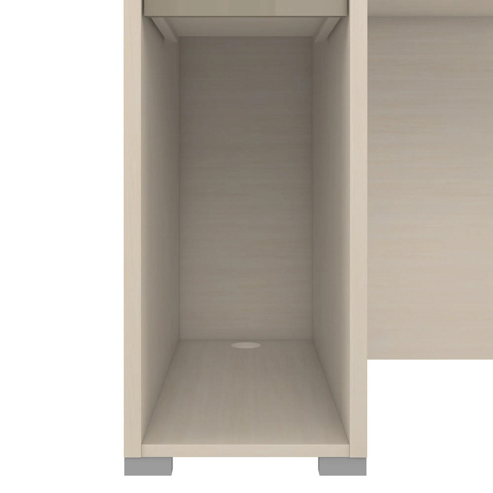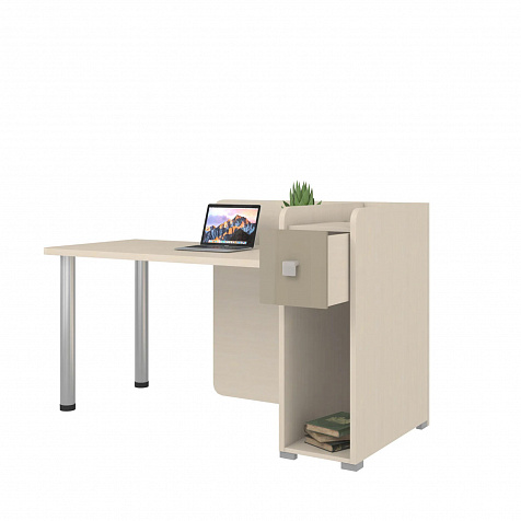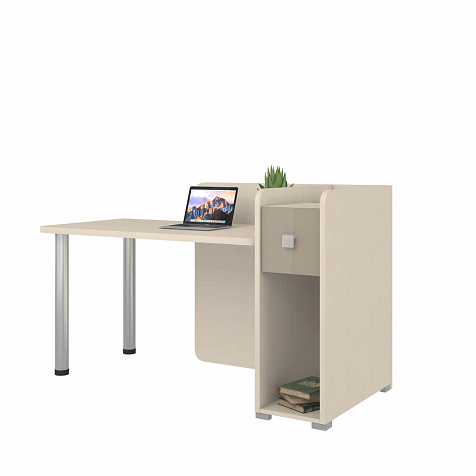 Тумба с нишей, ящиком и органайзером. Функциональная тумба имеет пространство для установки системного блока, над ней предусмотрен ящик, а за ящиком есть органайзер с двумя отделениями для канцелярских мелочей.