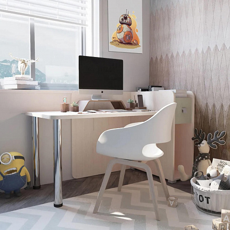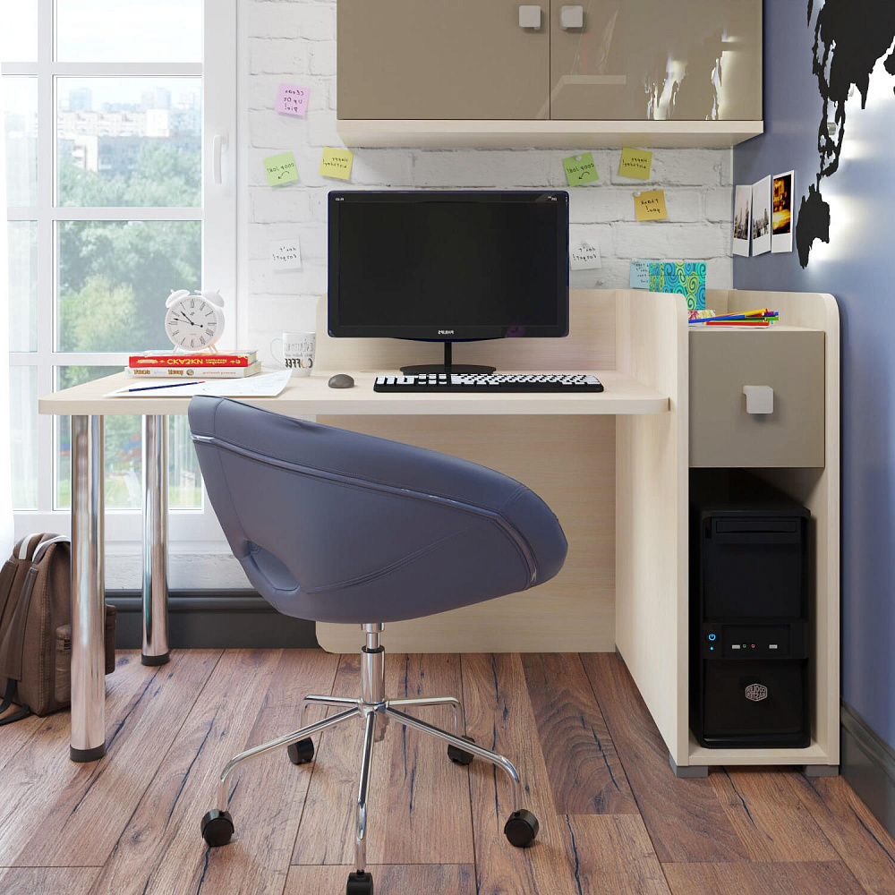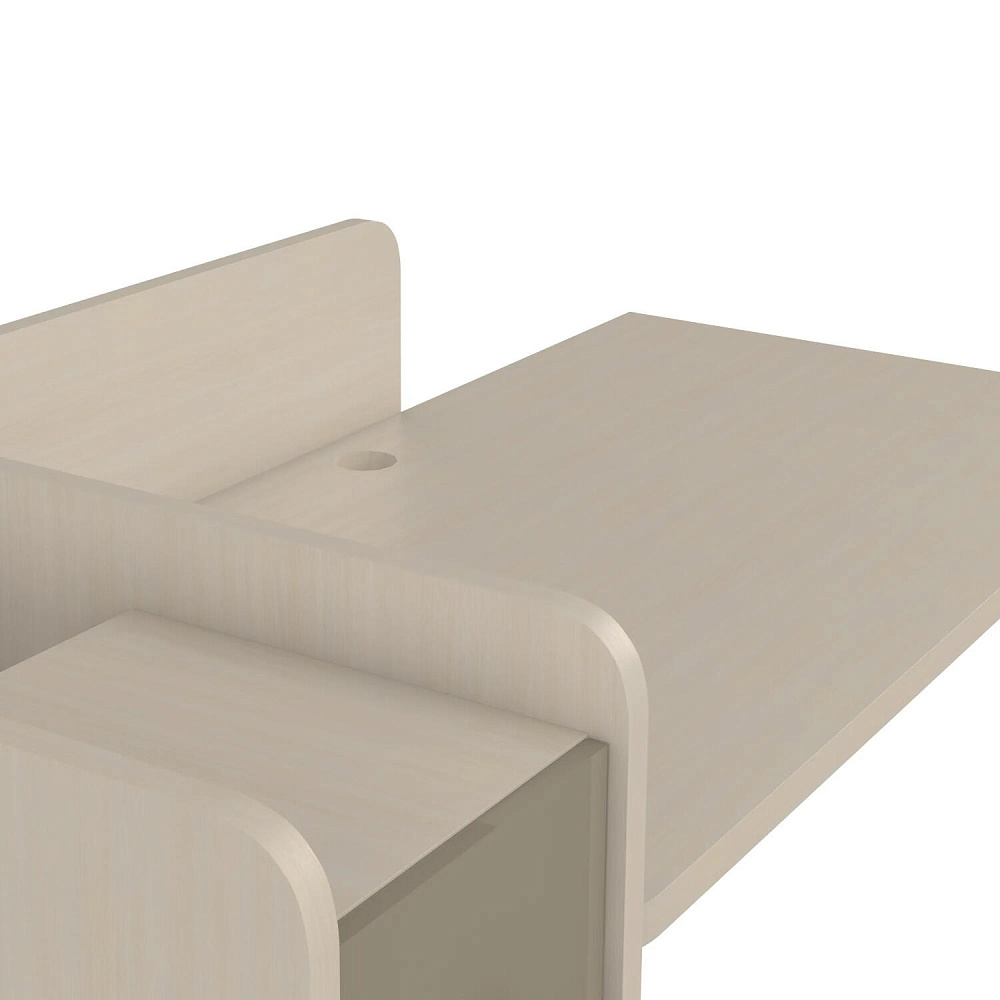Просторная столешница с отверстием для проводов. Широкая столешница позволяет установить компьютер и разложить необходимые для учёбы и творчества материалы. В крышке стола предусмотрено отверстие для удобного вывода проводов.