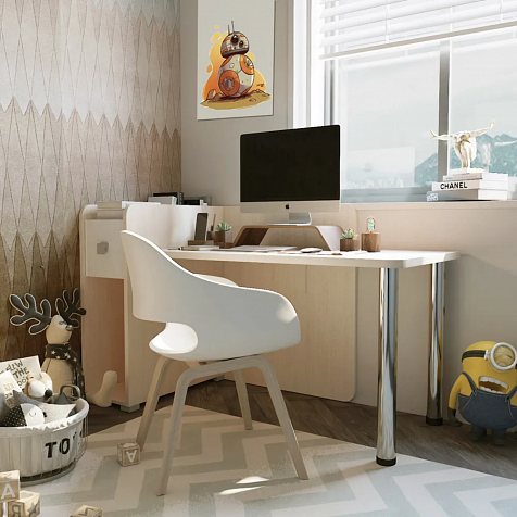 Просторная столешница с отверстием для проводов. Широкая столешница позволяет установить компьютер и разложить необходимые для учёбы и творчества материалы. В крышке стола предусмотрено отверстие для удобного вывода проводов.