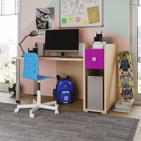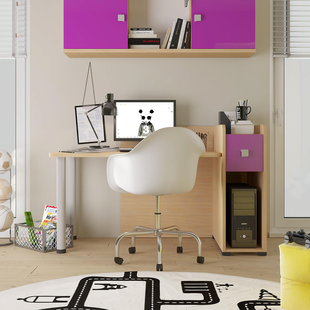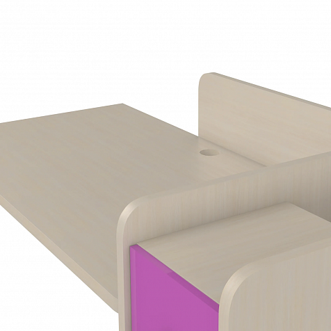 Просторная столешница с отверстием для проводов. Широкая столешница позволяет установить компьютер и разложить необходимые для учёбы и творчества материалы. В крышке стола предусмотрено отверстие для удобного вывода проводов.